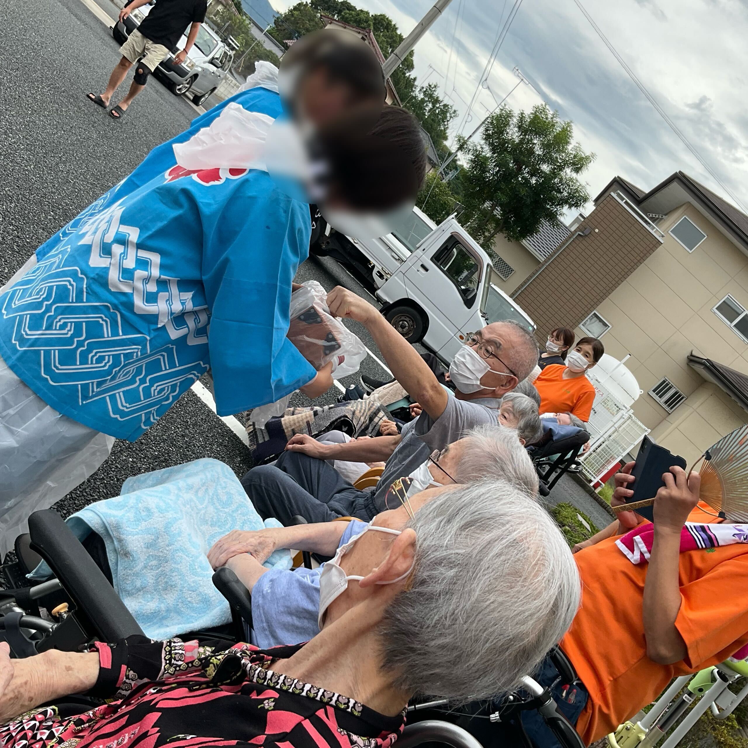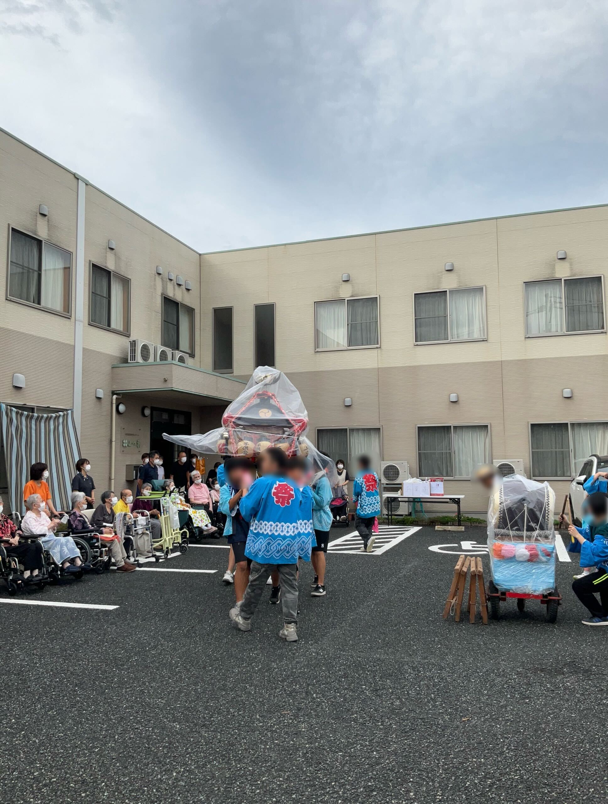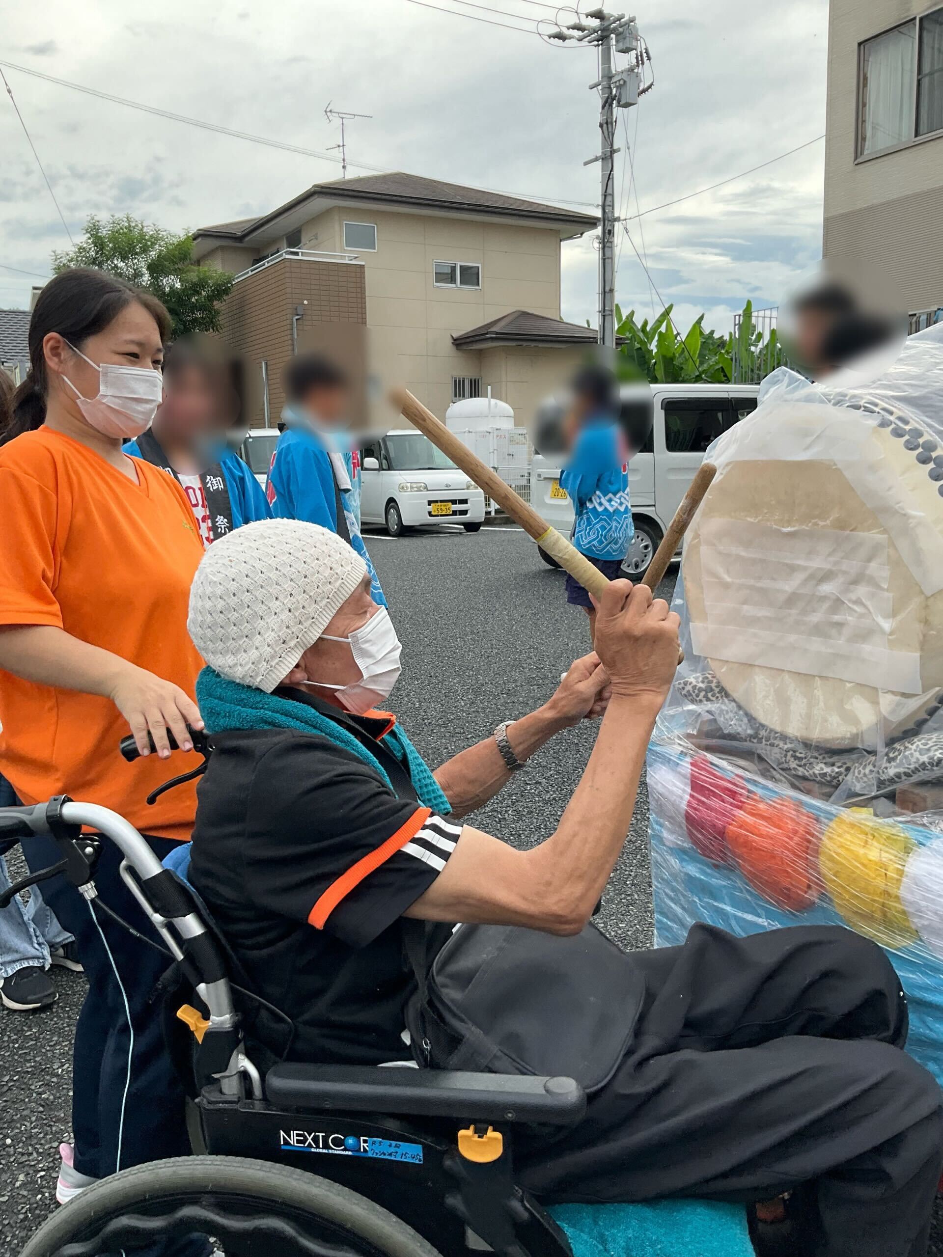 入居者の皆様は、子どもたちが持つお賽銭箱にお賽銭を入れたり、一緒に太鼓を叩いたりと、笑顔あふれるひとときを過ごされました。活気ある子どもたちとの交流は、大きな喜びと心温まる時間となりました。